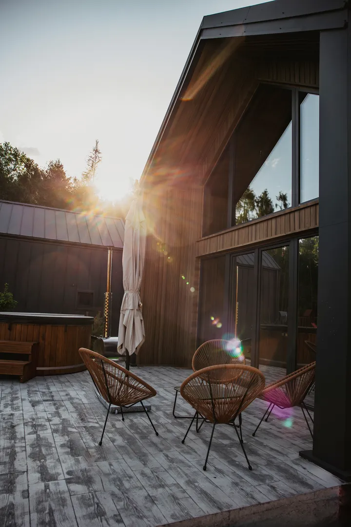 Nowoczesne całoroczne piętrowe domki z ogrzewaniem, kominkiem i klimatyzacją. W domkach znajduje się również salon z wyposażonym aneksem kuchennym oraz łazienka z ciepłą bieżącą wodą. Do dyspozycji są też 2 sypialnie. Przed każdym domkiem znajduje się balia z hydromasażem